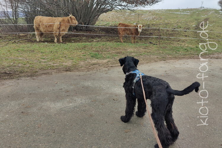Beim Spaziergang trafen die Jungs auf ein hübsches Hochlandrind mit Kalb.