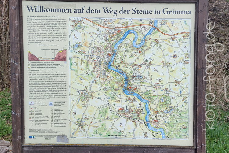 Auf dem Weg entlang der Mulde wurden insgesamt 28 Steinstationen errichtet. Dazu zählen Steinwegweiser, Sitzsteine, Standtafeln und Skulpturen.