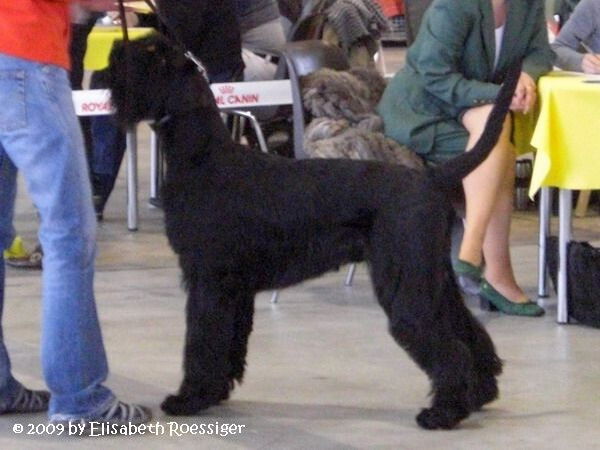 Harmonisch aufgebauter Rüde, Kopf etwas feminin, fehlt noch Vorbrust, komplettes Scherengebiss, lackschwarzes hartes Haar, zügiger Bewegungsablauf mit viel Schub, in der Vorderhand leicht eng
